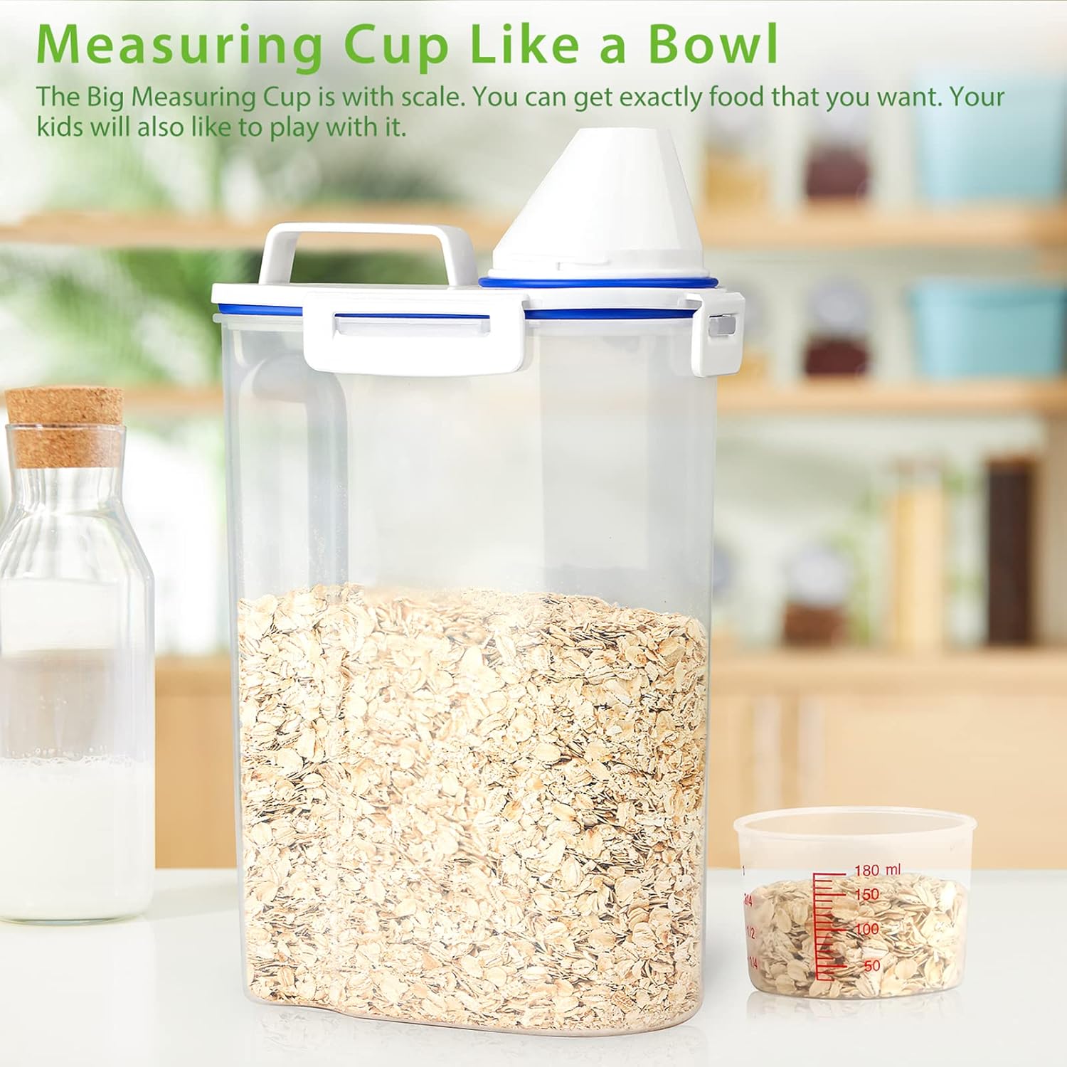 - RICE DISPENSER with POURABLE SPOUT: the standard scale and the measuring cup of this rice holder can help you pour things quickly and accurately every time. Our measuring cup has been upgraded and improved to be more stable and not easy to pops off