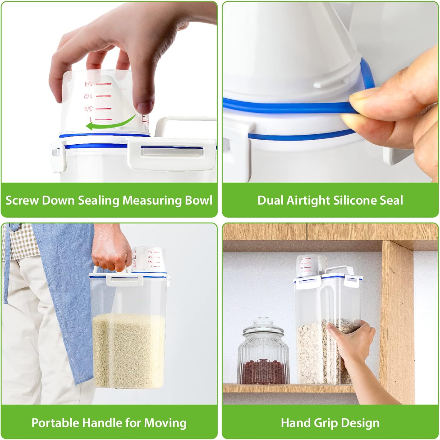 - AIRTIGHT& SPACE-SAVING: the airtight rice storage container will always protect your food from moisture. Four Strong Buckles seal the oatmeal container tightly, keep your food fresh and dry. The pantry rice containers with slim size and moderate height perfect for different size kitchen cabinets