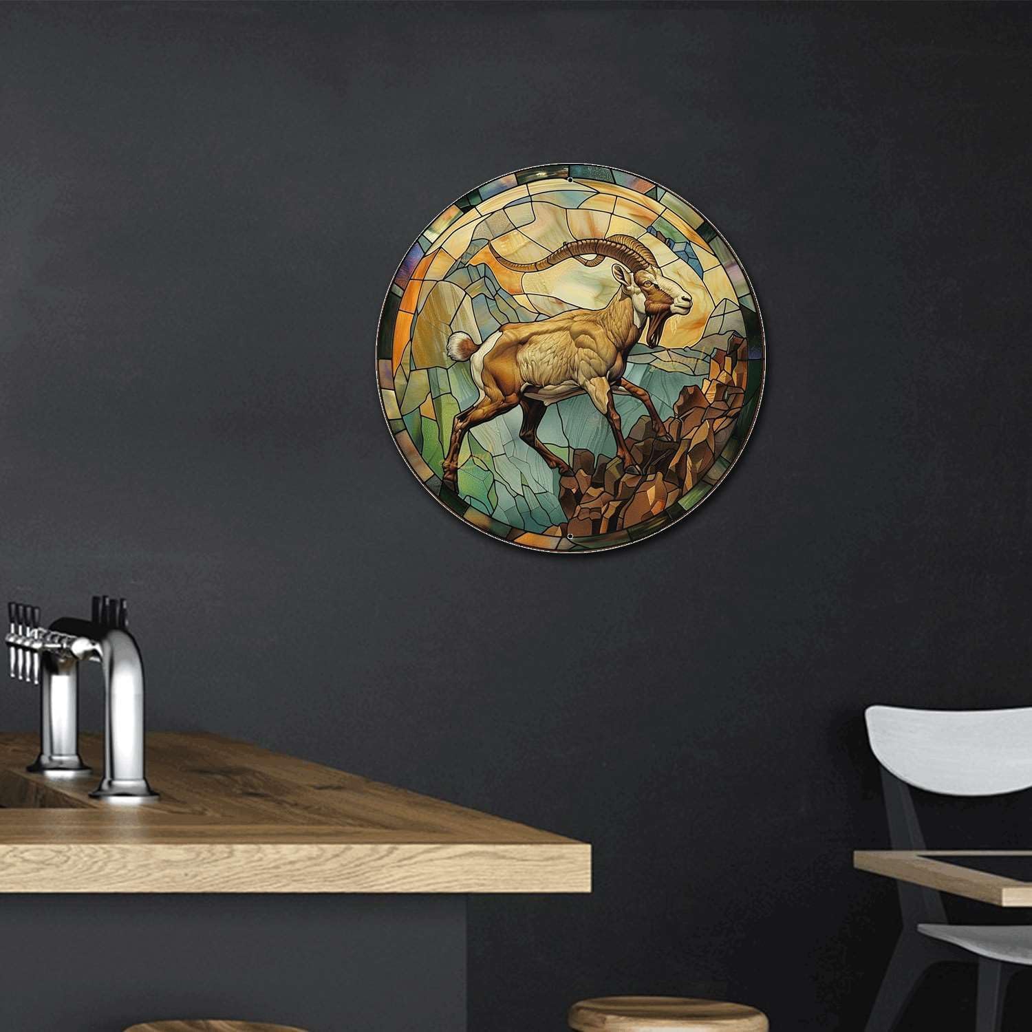 Lygond Metal Sign Tin Sign Circular Stained Glass Mountain Goat Wall Art for Bar 12×12 Inches