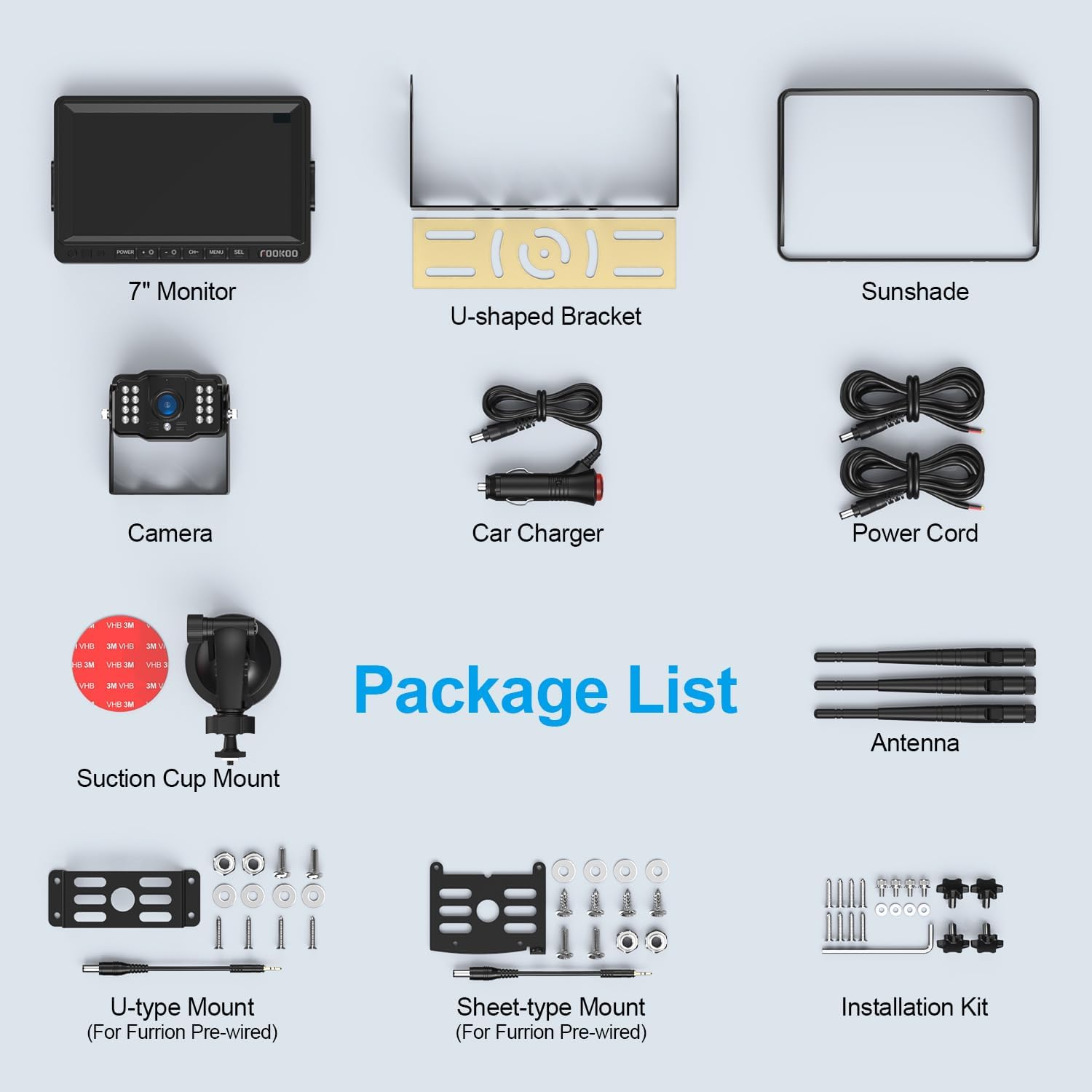 - Easy Installation: The system is easy to install and can be installed within 30 minutes. The display can be powered by a cigarette plug or a power cord. The power supply for the backup camera is provided by the car's 12-24V DC power supply/taillights/running lights/reversing lights. The package comes with two different types of furrion pre-wired adapters.Suitable for most furrion mounts on the market, you can install according to your needs