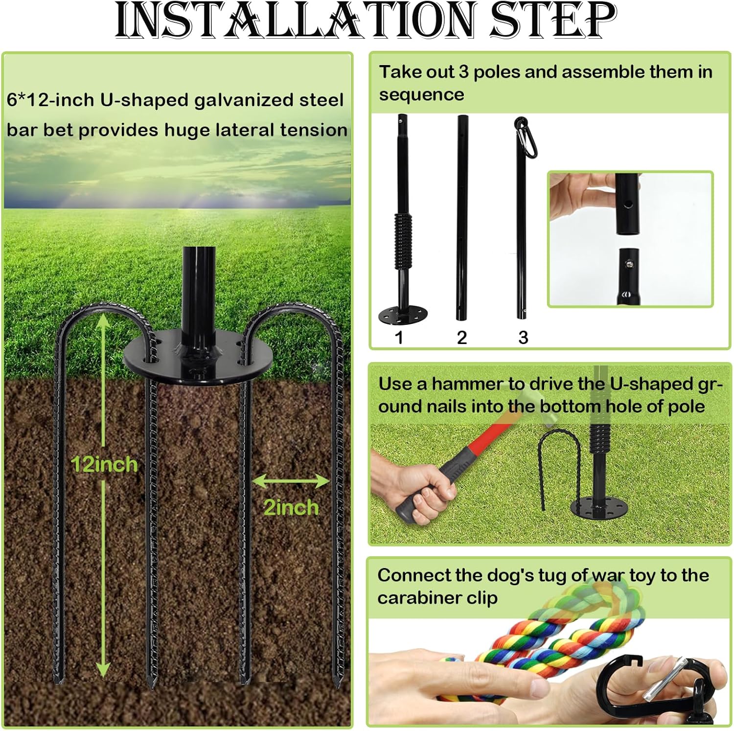 - Dog Solo Play:The tether dog tug toy attracts the dog's chase in the shaking and swing. Pulling and tugging make them endlessly busy,which can release the owner's hands and relieve dog boredom. Compared to traditional outdoor bungee toys that are difficult to install, our toys no need for trees and more convenient to install ,one person can also install them independently on grass
