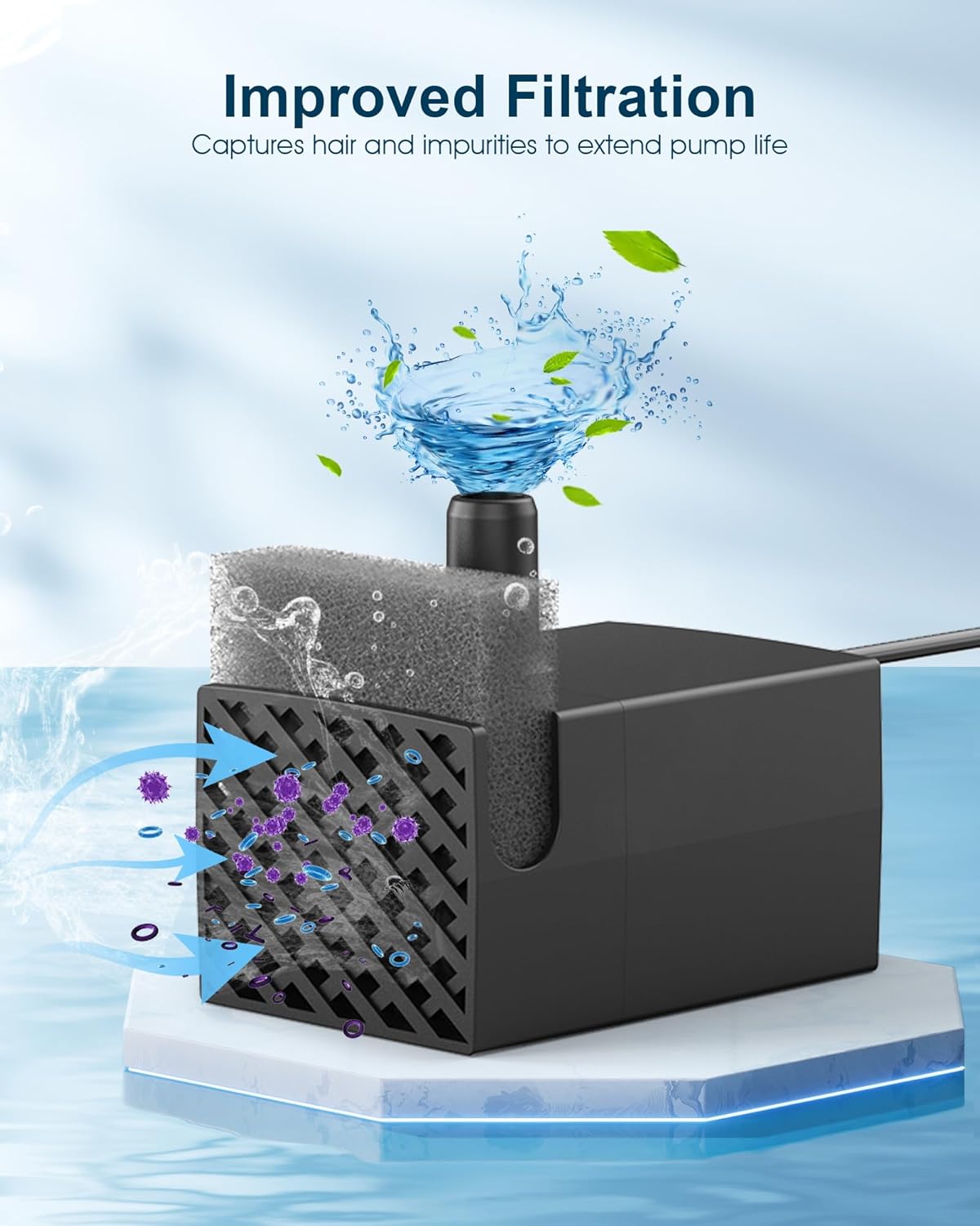 - Extended Lifespan Design: The water pump features a built-in filter sponge to trap hair and impurities, along with a durable ceramic shaft. This design helps keep your pet's water cleaner for longer and extends pump life. Operating at just 5 volts, it's energy-efficient and safe for pets. The 6.6-foot power cord offers flexible placement, making it a convenient and reliable choice for your pet's hydration needs
