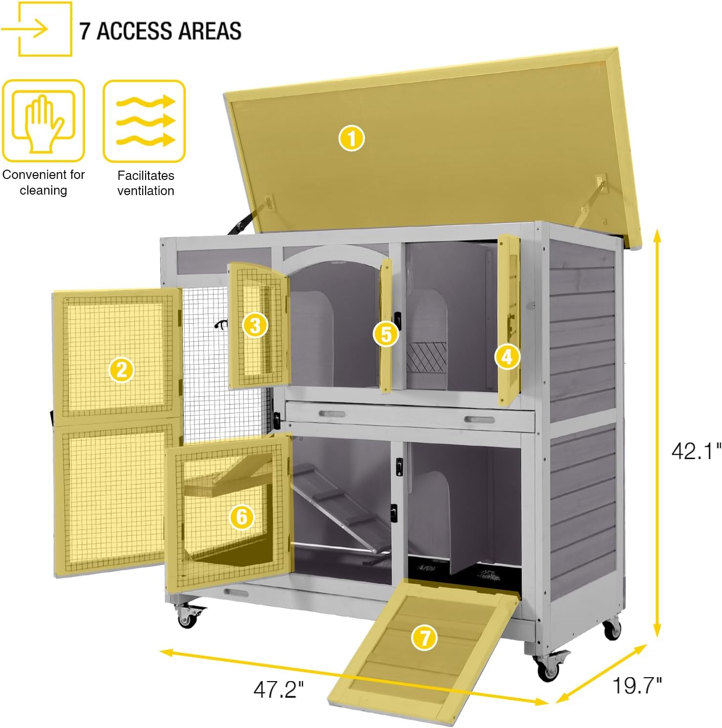 - 𝐒𝐚𝐟𝐞 𝐌𝐨𝐯𝐞𝐦𝐞𝐧𝐭 & 𝐀𝐜𝐜𝐞𝐬𝐬 - Anti - slip ramp and 7 access areas ensure safe pet movement and easy cleaning. Perfect for small animal cage needs, prioritizing safety and usability